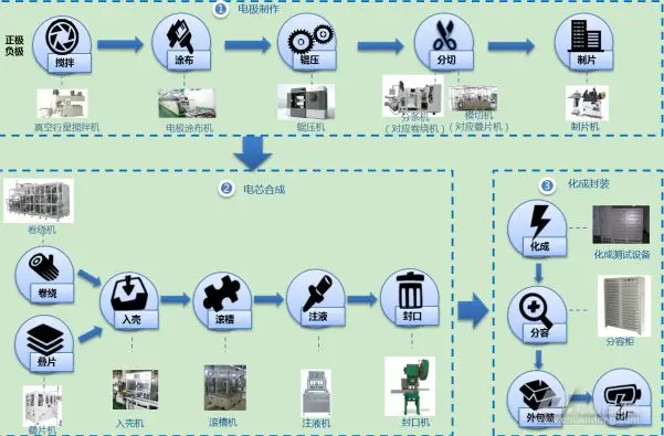 在新能源快速發(fā)展的市場環(huán)境下,鋰離子電池的應(yīng)用可說是目前新能源發(fā)展較為明顯的產(chǎn)業(yè),鋰離子電池是一個復(fù)雜的體系,包含了正極、負(fù)極、隔膜、電解液、集流體和粘結(jié)劑、導(dǎo)電劑等,涉及的反應(yīng)包括正負(fù)極的電化學(xué)反應(yīng)、鋰離子傳導(dǎo)和電子傳導(dǎo),以及熱量的擴(kuò)散等。整體上可將鋰電制造流程劃分為前段工序(極片制造)、中段工序(電芯合成)、后段工序(化成封裝)。